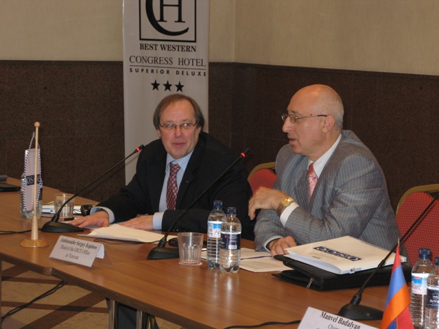 Amb. Sergey Kapinos (r), Head of the OSCE Office in Yerevan, and Alexander Boldyrev, Senior Adviser to the Representative on Freedom of the Media, at a seminar to boost co-operation between state press officers and the media, Yerevan, 27 October 2008.