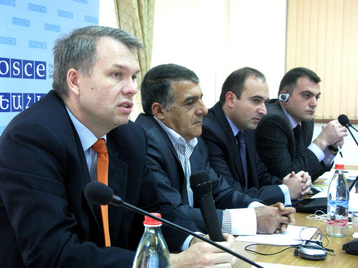 Vladimir Tchountoulov (l), Human Rights Officer at the OSCE Office in Yerevan, speaks at an event to present an OSCE-supported study on establishing a probation service in Armenia, Yerevan, 12 November 2012.