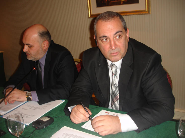 Robert Sanoyan (left) and Armen Arakelyan from the Armenian National Movement political party discuss the amended law on assembly at a meeting in Yerevan, 6 November 2008.