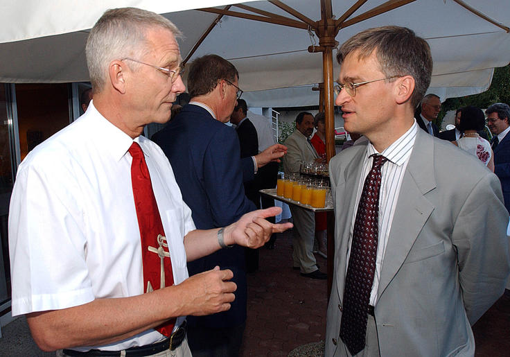 Head of the OSCE Mission to Croatia, Ambassador Peter Semneby (right), with Swedish Ambassador Sture Theolin at the International Conference on the Integration of Minorities in Southeastern Europe and the Baltic States, Zagreb, 2 July 2003.
