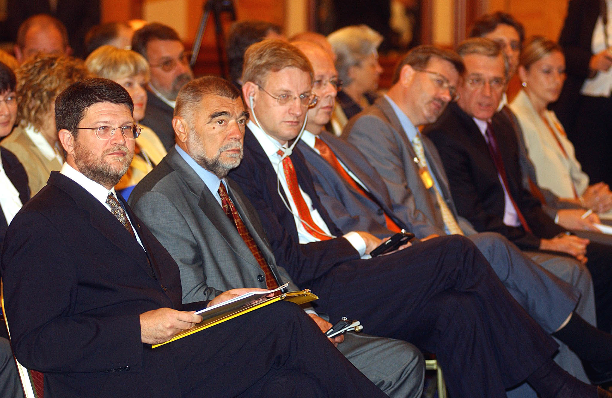 Croatian Foreign Minister Tonino Picula (left), President Stjepan Mesic (centre) and Carl Bildt, former High Representative in Bosnia-Herzegovina attended the Integration of Minorities in Southeastern Europe and the Baltic States, Zagreb, 2 July 2003.