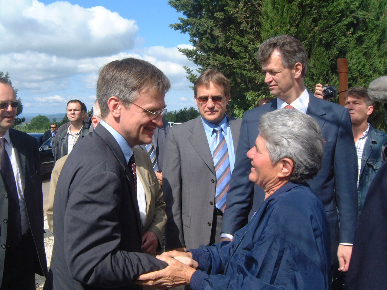 Head of OSCE Mission to Croatia, Ambassador Peter Semneby, greets a Serb returnee to the village of Biljane Donje, 11 May 2004.