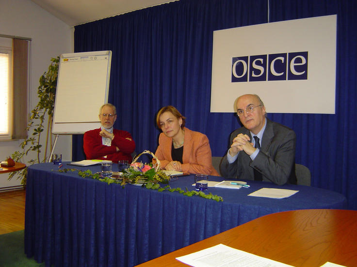 Vesna Pusic (centre), Croatian Peoples' Party President and Deputy Sabor Speaker, with Head of the OSCE Mission to Croatia Jorge Fuentes (right) and Deputy Head Robert W. Becker, Zagreb, 27 January 2006.
