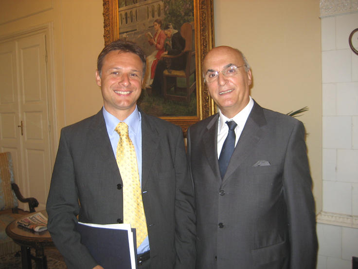 Head of the OSCE Office in Zagreb, Ambassador Jorge Fuentes (right), and Croatian Foreign Minister Gordan Jandrokovic at a meeting on the progress of the Mission's mandate, Zagreb, 29 August 2008.